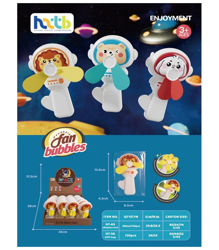 Дизайн та тематика : кожен вентилятор виконаний у вигляді милого звіра, одягненого в космічний скафандр. В асортименті присутні такі персонажі, як лев, собачка та ведмежа. Ці образи миттєво привертають увагу дітей і стимулюють їхню уяву, змушуючи занурюватися у світ космічних пригод.