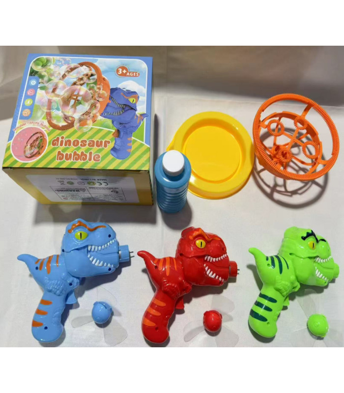 У комплект входить баночка з мильним розчином об'ємом 80 мілілітрів, а також спеціальне блюдце для зручного наповнення пристрою. Необхідно просто прикрутити пропелер до дула та вставити насадку. Встановлення трьох батарей АА в спеціальний відсік на спині динозавра займе лише кілька хвилин. В результаті діти зможуть миттєво насолодитися грою, буквально занурюючись у море мильних бульбашок.